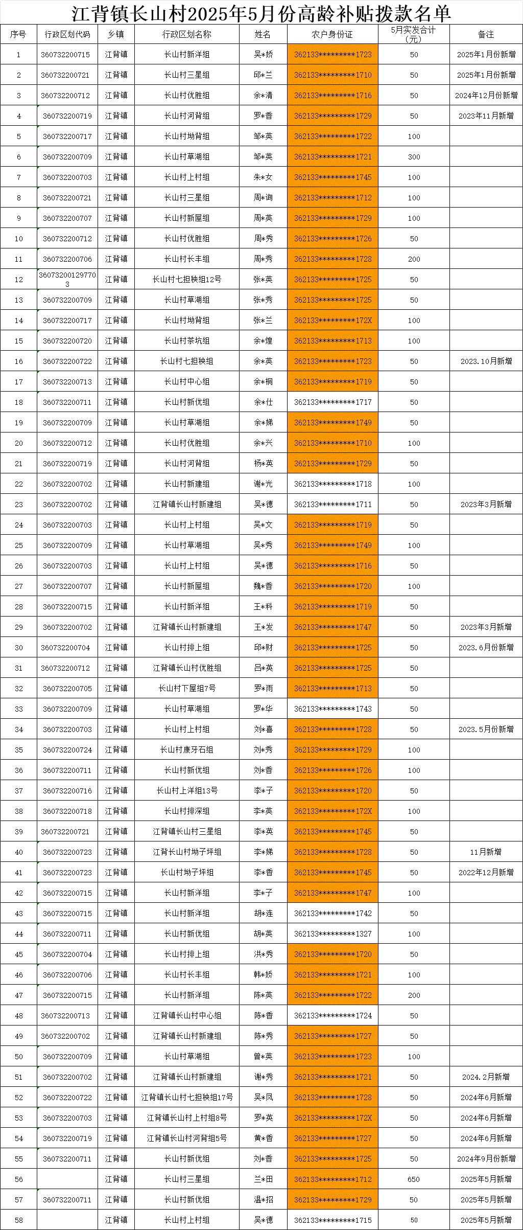 【養老服務】江背鎮長山村2025年5月份高齡補貼撥款名單