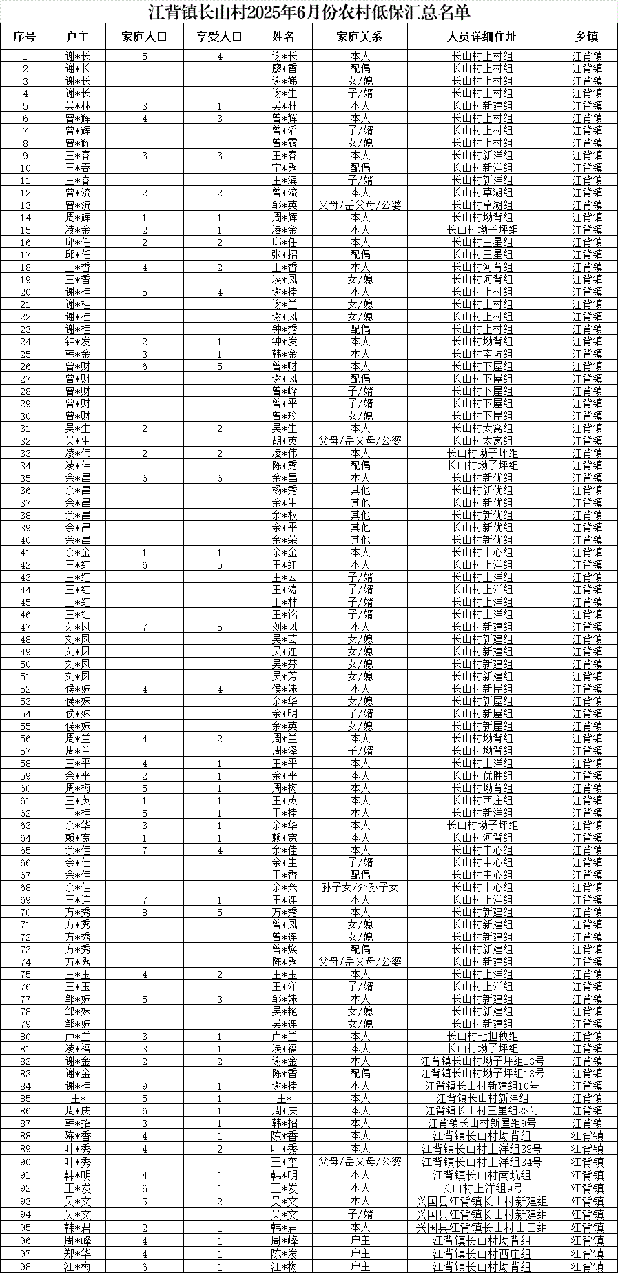 【社會救助】江背鎮長山村2025年6月份農村低保匯總名單