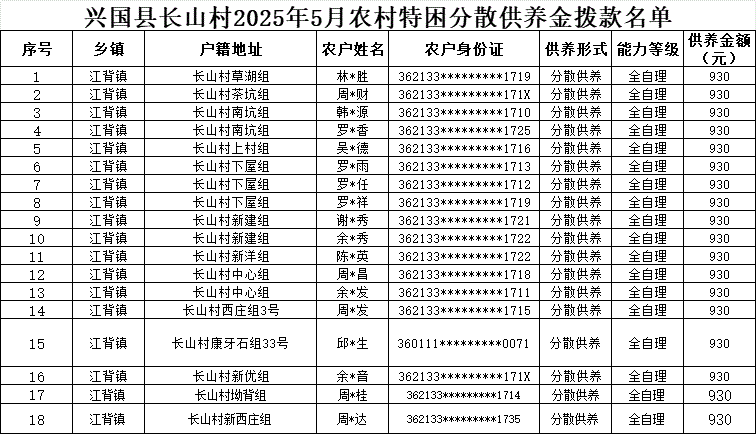 【社會救助】興國縣長山村2025年5月農村特困分散供養金撥款名單