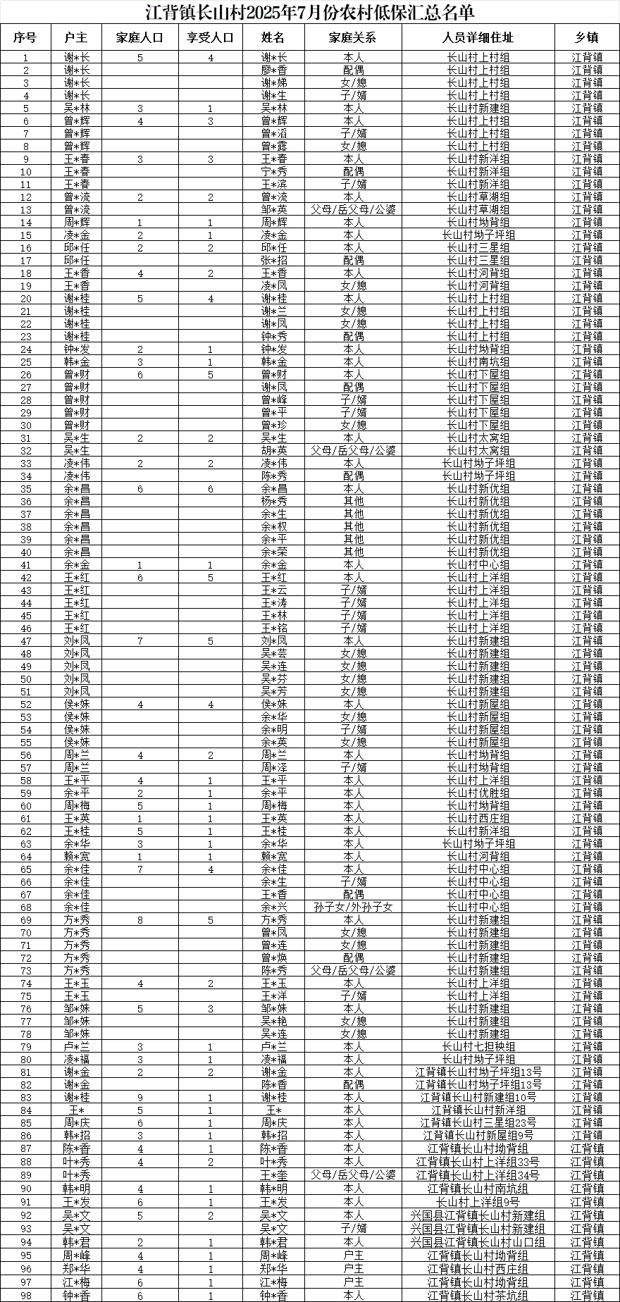 【社會救助】江背鎮長山村2025年7月份農村低保匯總名單