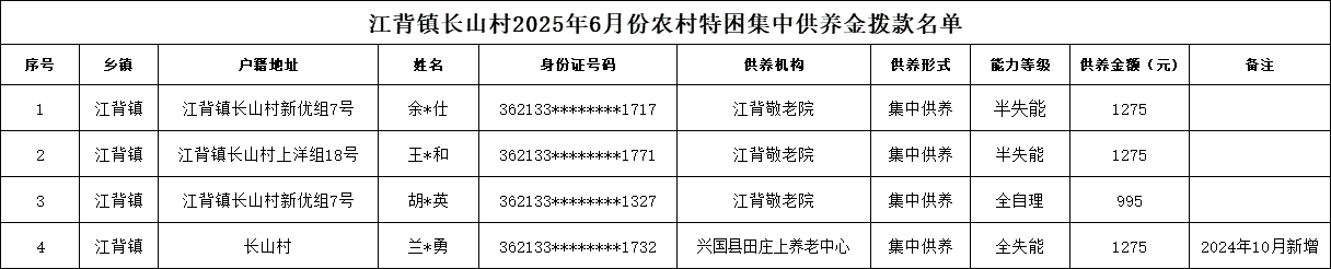 【社會救助】江背鎮(zhèn)長山村2025年6月份農(nóng)村特困集中供養(yǎng)金撥款名單