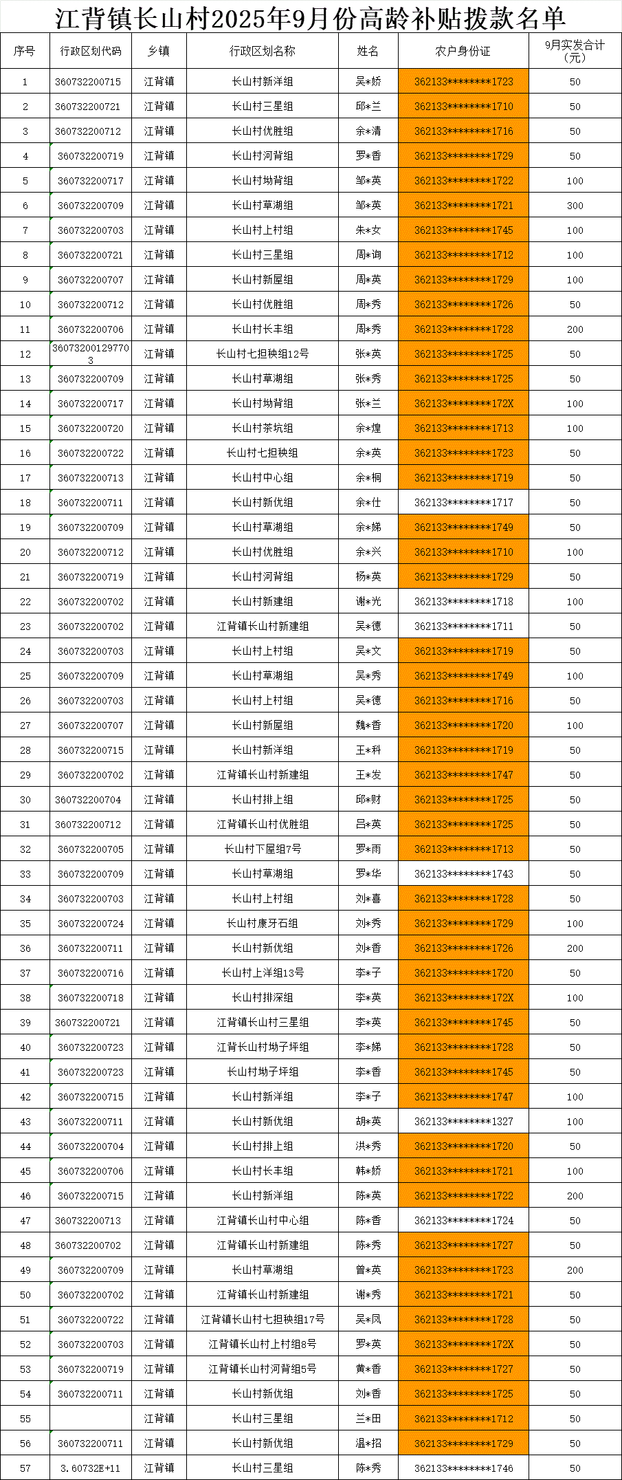 【養老服務】江背鎮長山村2025年9月份高齡補貼撥款名單