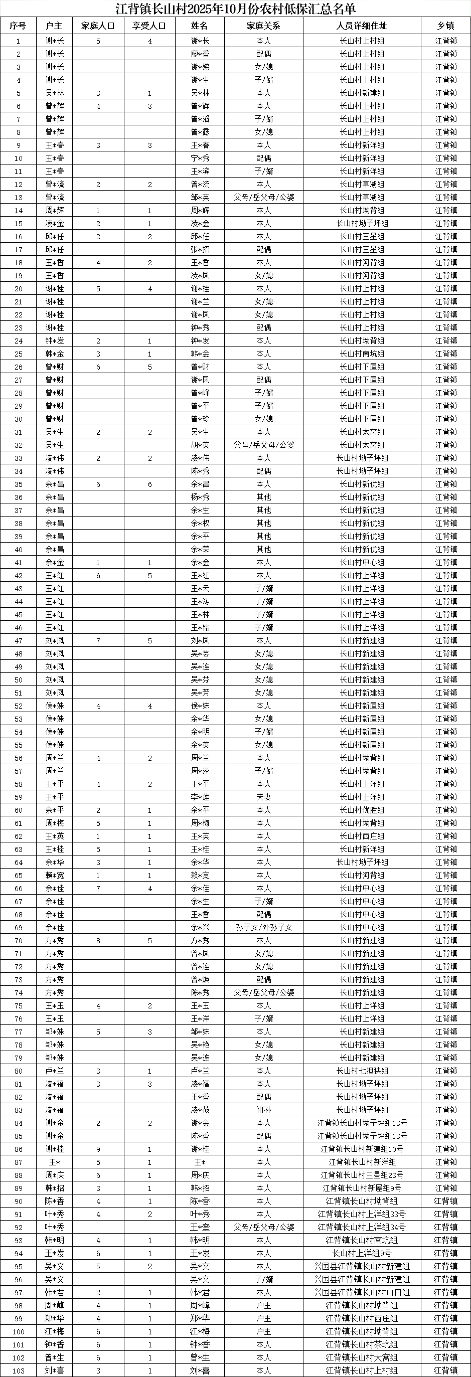 【社會救助】江背鎮長山村2025年10月份農村低保匯總名單