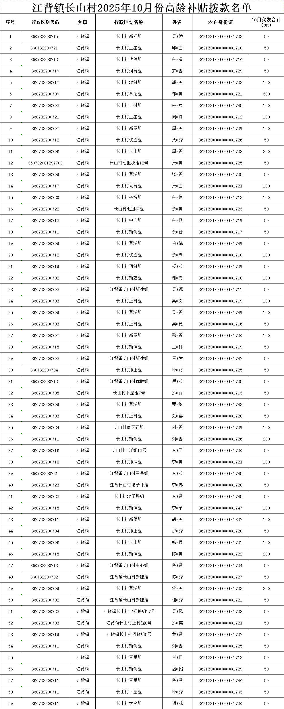 【養老服務】江背鎮長山村2025年10月份高齡補貼撥款名單