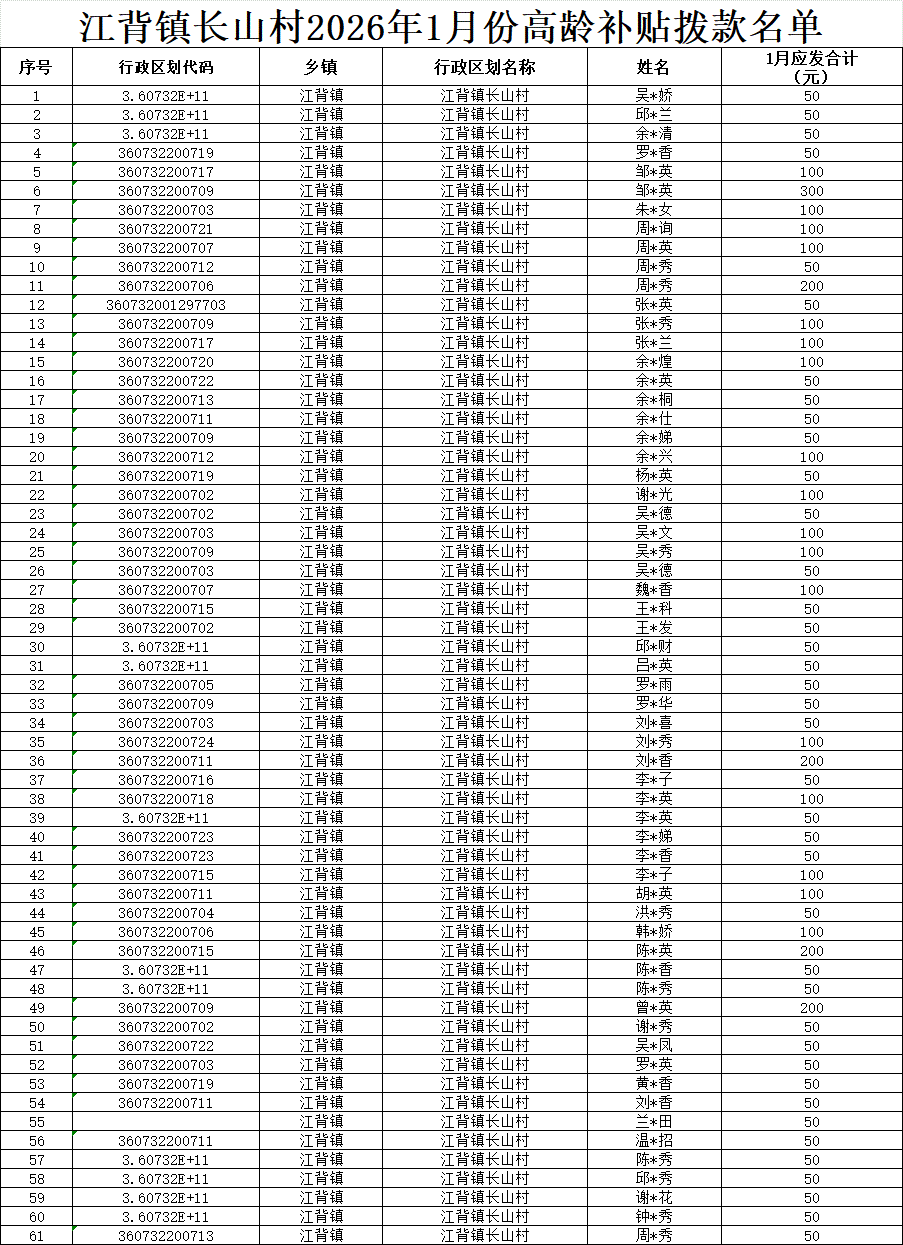 【養老服務】江背鎮長山村2026年1月份高齡補貼撥款名單