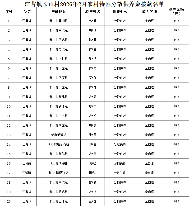 【社會救助】江背鎮長山村2026年2月農村特困分散供養金撥款名單