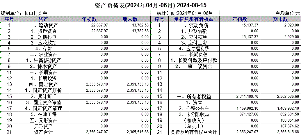 【財(cái)務(wù)收支】長(zhǎng)山村2024年第二季度資產(chǎn)負(fù)債表公示