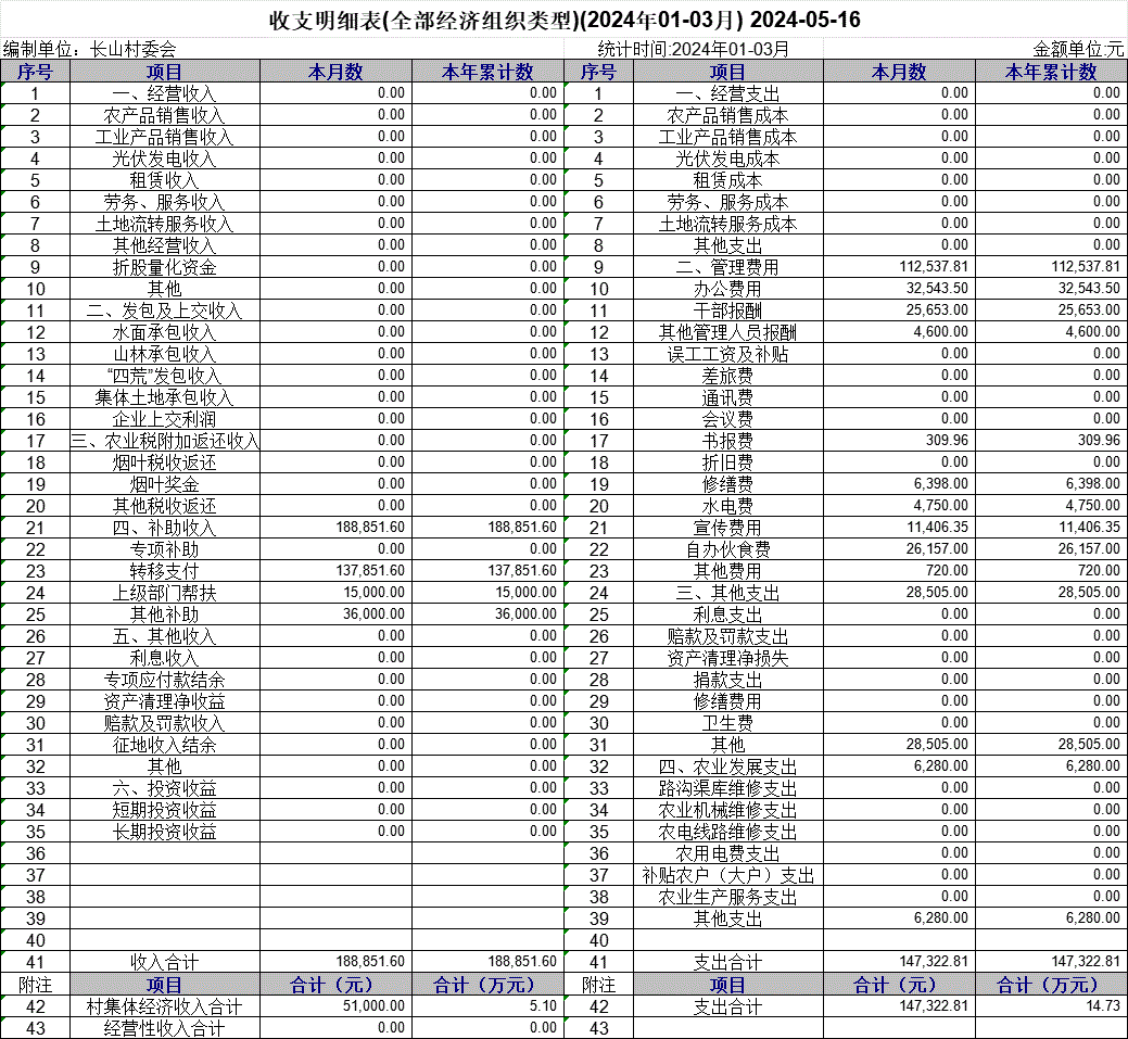 【財務收支】長山村2024年第一季度收支明細表公示