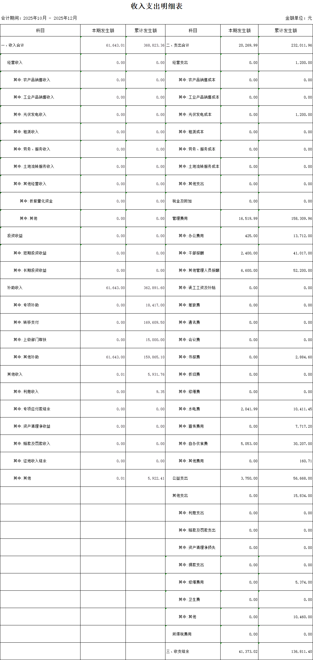 【財務收支】長山村2025年第四季度收支明細表公示