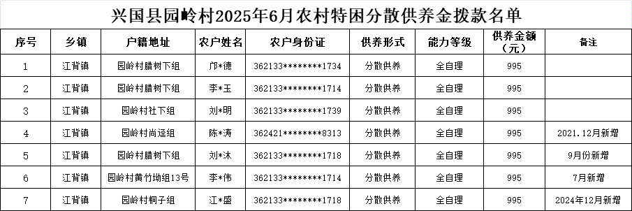 【社會(huì)救助】興國縣園嶺村2025年6月農(nóng)村特困分散供養(yǎng)金撥款名單