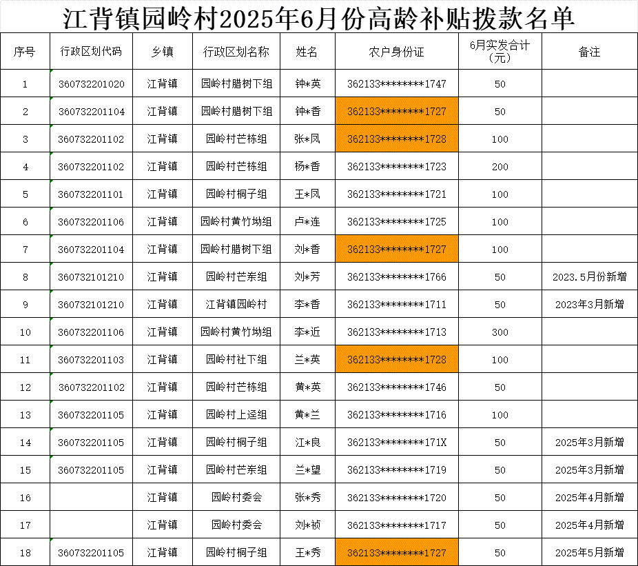 【養老服務】江背鎮園嶺村2025年6月份高齡補貼撥款名單