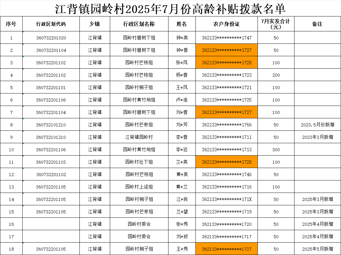 【養老服務】江背鎮園嶺村2025年7月份高齡補貼撥款名單