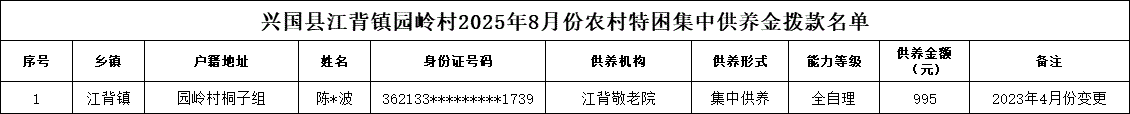 【社會救助】江背鎮園嶺村2025年8月份農村特困集中供養金撥款名單