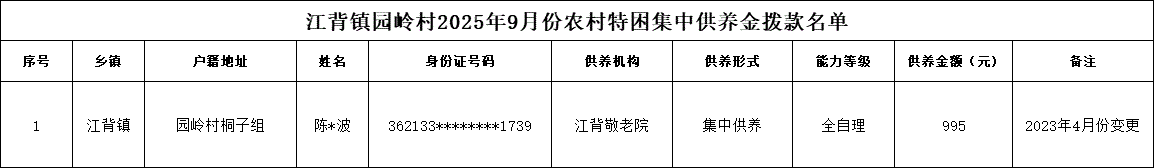 【社會救助】江背鎮園嶺村2025年9月份農村特困集中供養金撥款名單