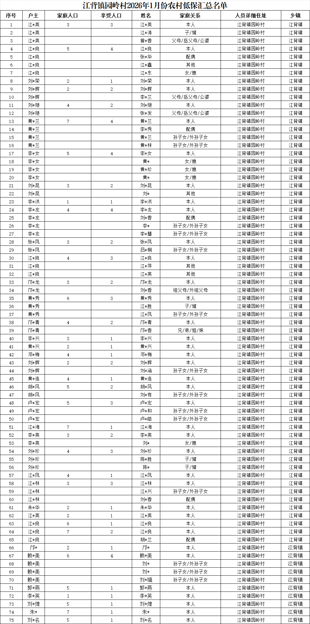 【社會救助】江背鎮園嶺村2026年1月份農村低保匯總名單