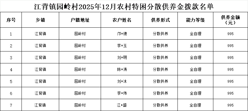 【社會救助】江背鎮園嶺村2025年12月農村特困分散供養金撥款名單
