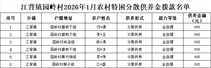 【社會救助】江背鎮園嶺村2026年1月農村特困分散供養金撥款名單