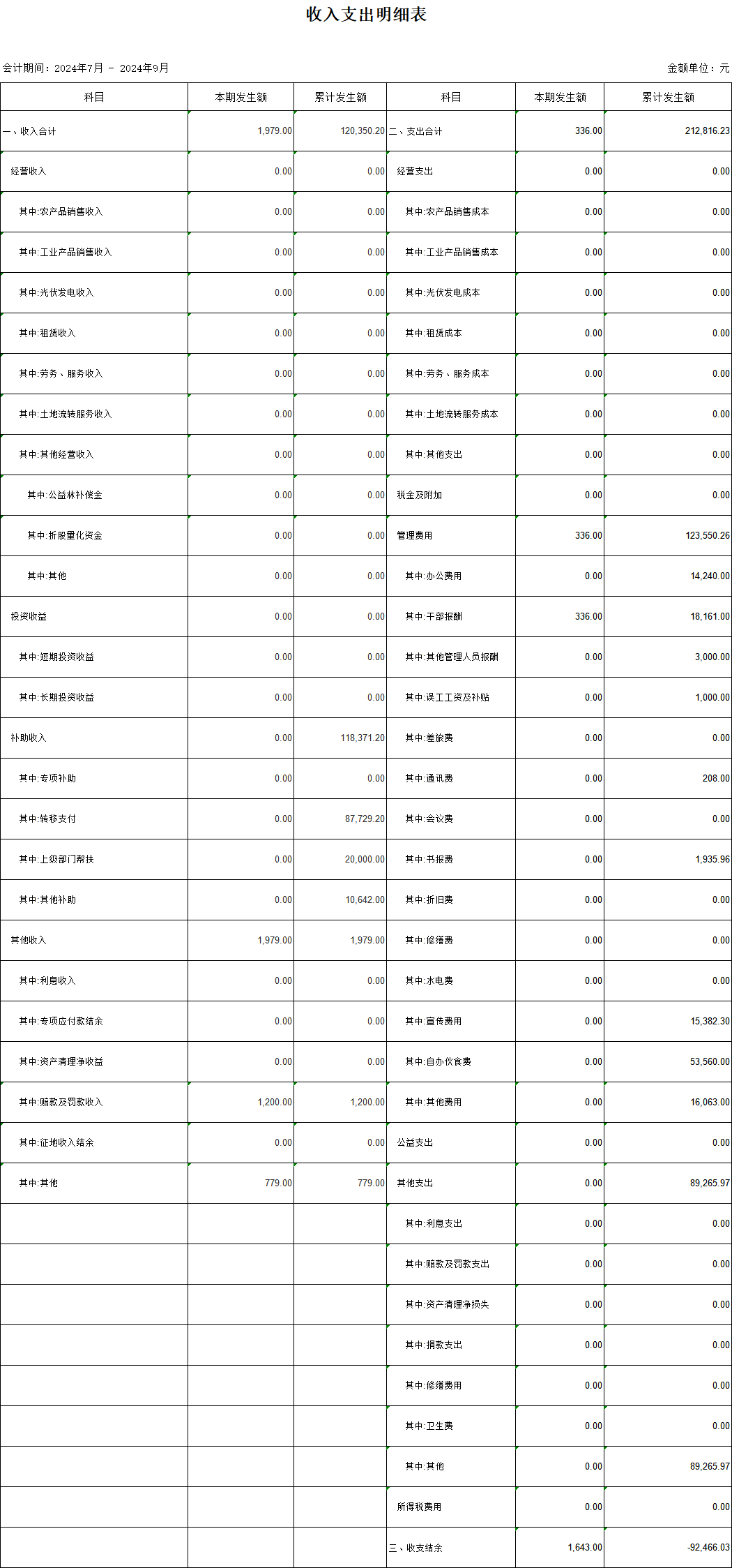 【財務收支】園嶺村2024年第三季度收支明細表公示