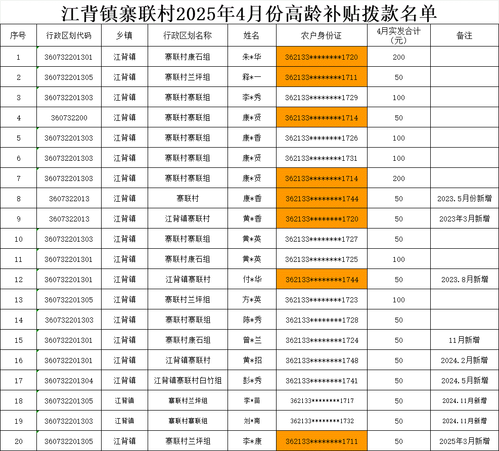 【養老服務】江背鎮寨聯村2025年4月份高齡補貼撥款名單