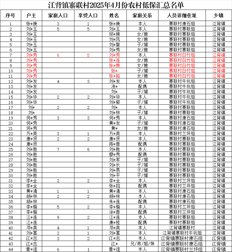 【社會救助】江背鎮寨聯村2025年4月份農村低保匯總名單