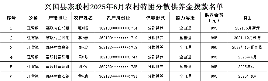 【社會(huì)救助】興國縣寨聯(lián)村2025年6月農(nóng)村特困分散供養(yǎng)金撥款名單