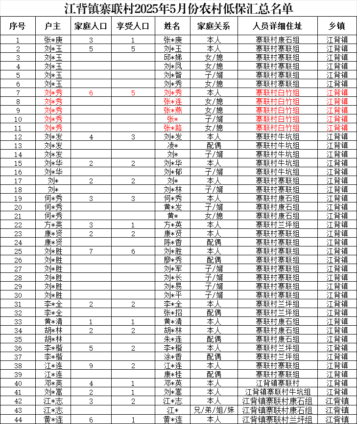 【社會救助】江背鎮寨聯村2025年5月份農村低保匯總名單