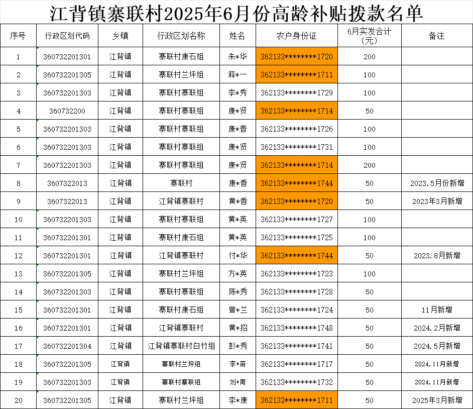 【養老服務】江背鎮寨聯村2025年6月份高齡補貼撥款名單