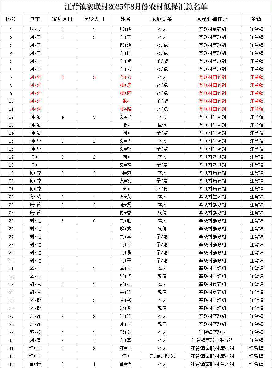 【社會救助】江背鎮寨聯村2025年8月份農村低保匯總名單
