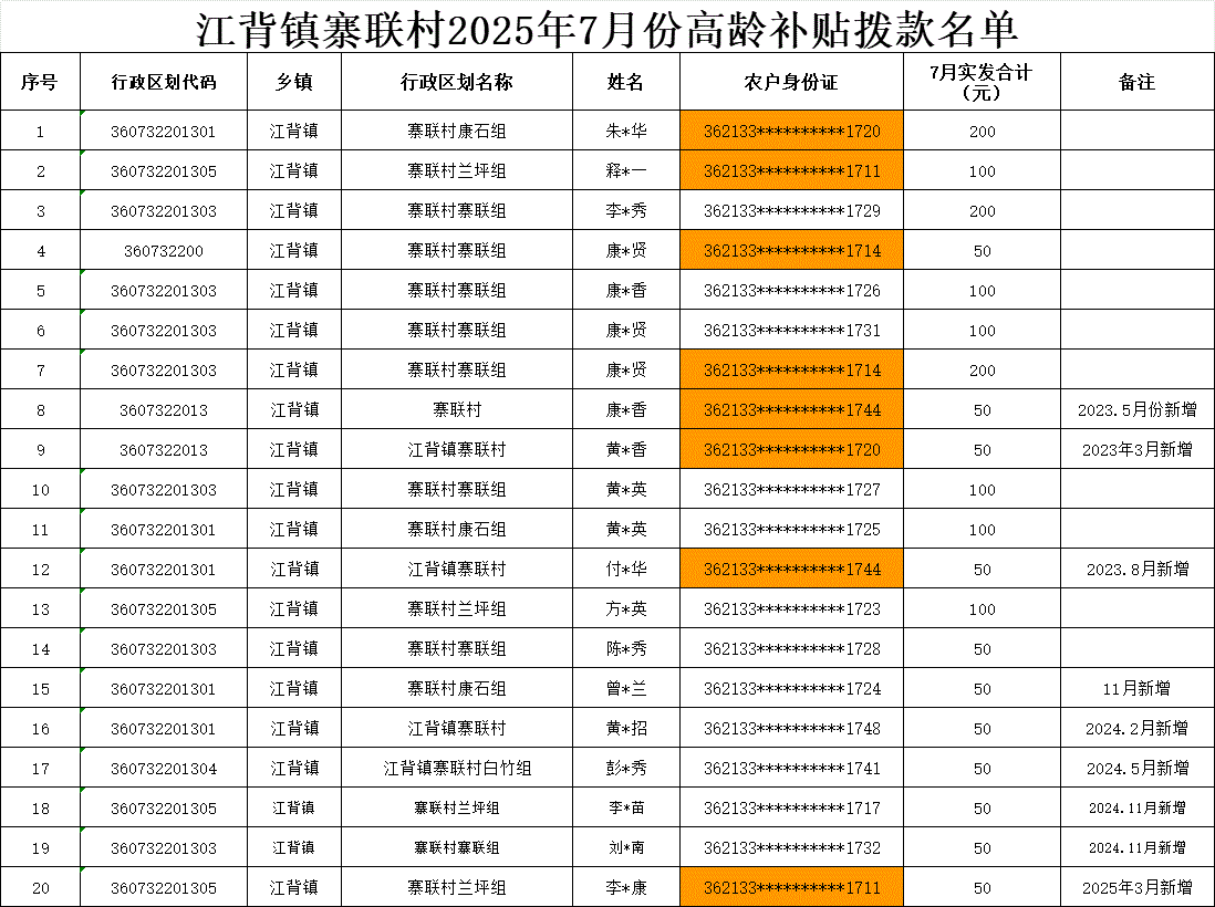 【養老服務】江背鎮寨聯村2025年7月份高齡補貼撥款名單