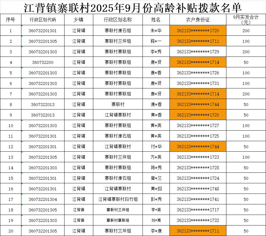 【養(yǎng)老服務(wù)】江背鎮(zhèn)寨聯(lián)村2025年9月份高齡補(bǔ)貼撥款名單