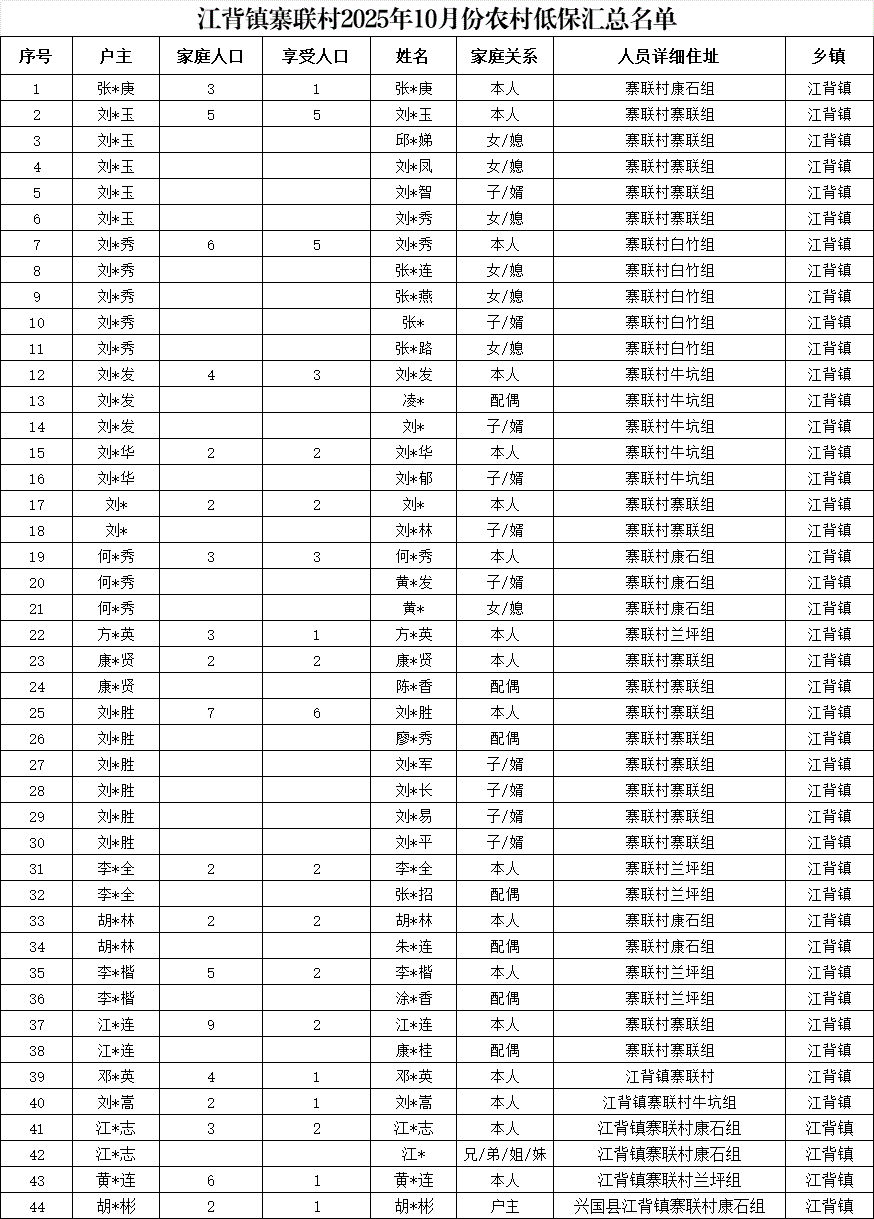 【社會救助】江背鎮(zhèn)寨聯(lián)村2025年10月份農(nóng)村低保匯總名單