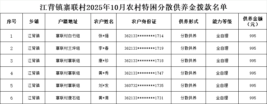 【社會救助】江背鎮寨聯村2025年10月農村特困分散供養金撥款名單