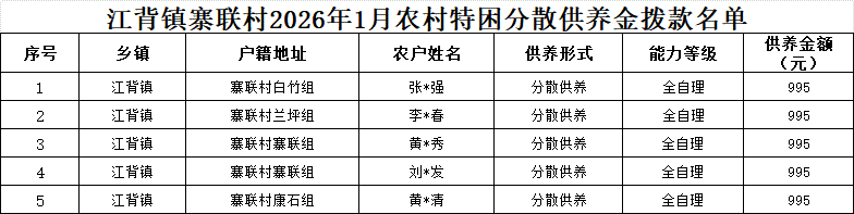 【社會救助】江背鎮(zhèn)寨聯(lián)村2026年1月農(nóng)村特困分散供養(yǎng)金撥款名單