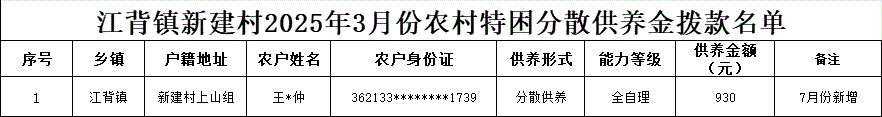 【社會(huì)救助】江背鎮(zhèn)新建村2025年3月份農(nóng)村特困分散供養(yǎng)金撥款名單