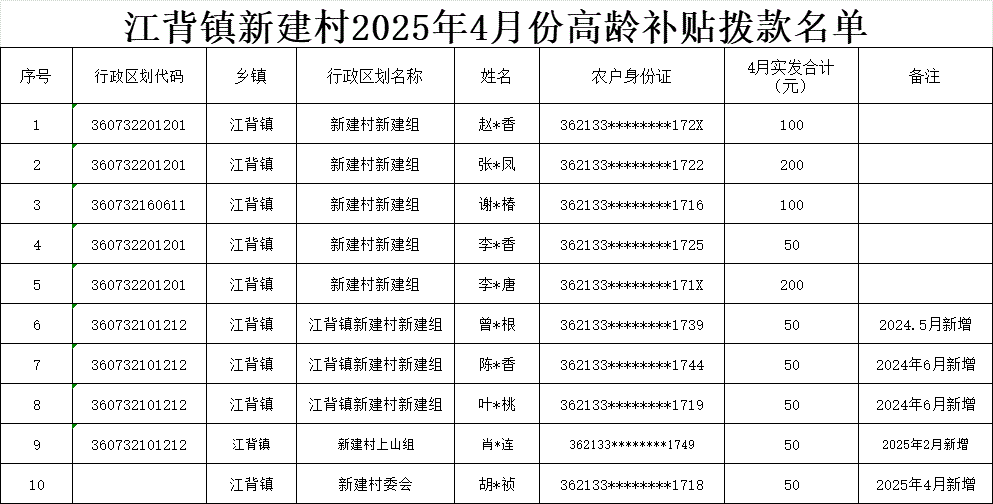 【養(yǎng)老服務(wù)】江背鎮(zhèn)新建村2025年4月份高齡補(bǔ)貼撥款名單
