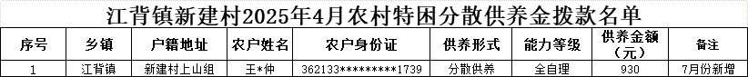 【社會救助】江背鎮新建村2025年4月農村特困分散供養金撥款名單