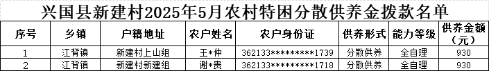 【社會(huì)救助】興國(guó)縣新建村2025年5月農(nóng)村特困分散供養(yǎng)金撥款名單