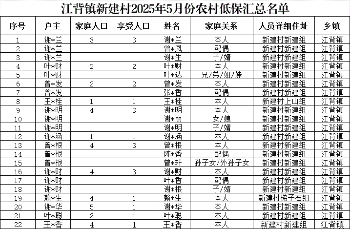 【社會救助】江背鎮新建村2025年5月份農村低保匯總名單