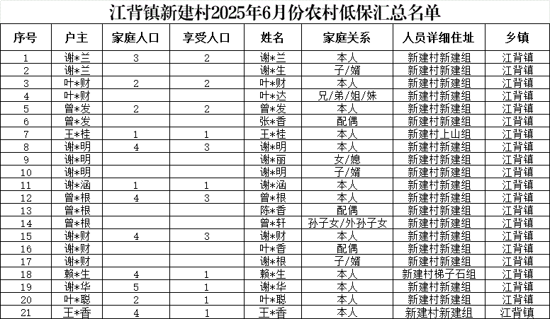【社會救助】江背鎮新建村2025年6月份農村低保匯總名單