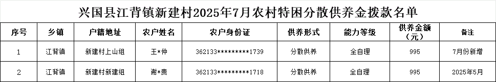 【社會救助】興國縣江背鎮新建村2025年7月農村特困分散供養金撥款名單