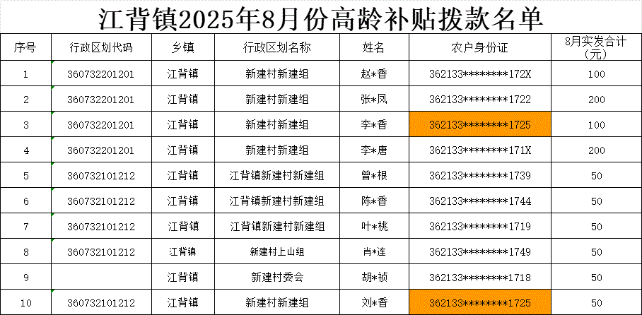 【養老服務】江背鎮2025年8月份高齡補貼撥款名單