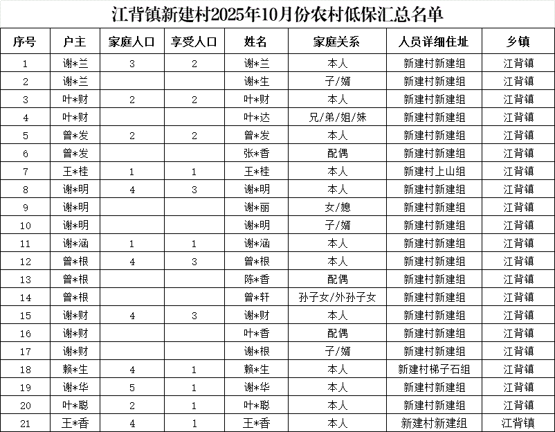【社會救助】江背鎮新建村2025年10月份農村低保匯總名單