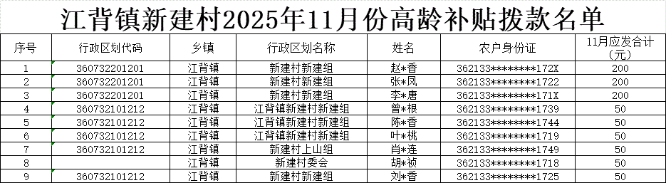 【養老服務】江背鎮新建村2025年11月份高齡補貼撥款名單