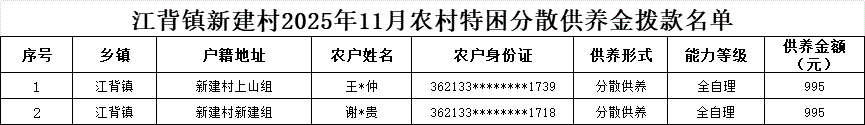 【社會救助】江背鎮新建村2025年11月農村特困分散供養金撥款名單