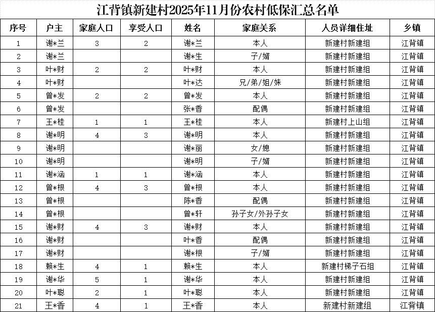 【社會救助】江背鎮新建村2025年11月份農村低保匯總名單