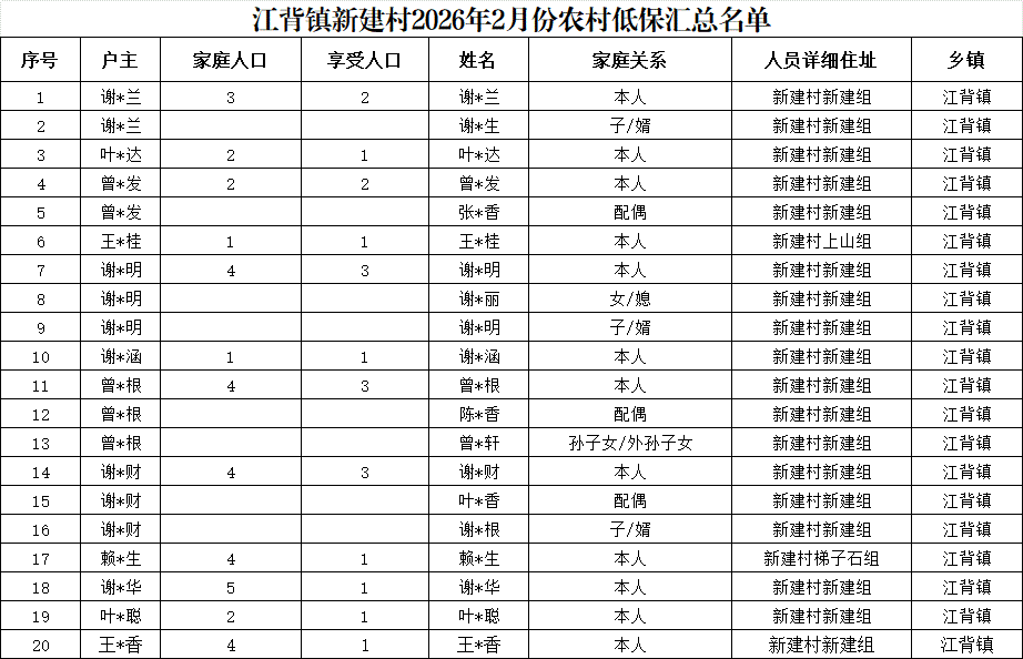 【社會救助】江背鎮新建村2026年2月份農村低保匯總名單