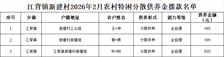 【社會(huì)救助】江背鎮(zhèn)新建村2026年2月農(nóng)村特困分散供養(yǎng)金撥款名單