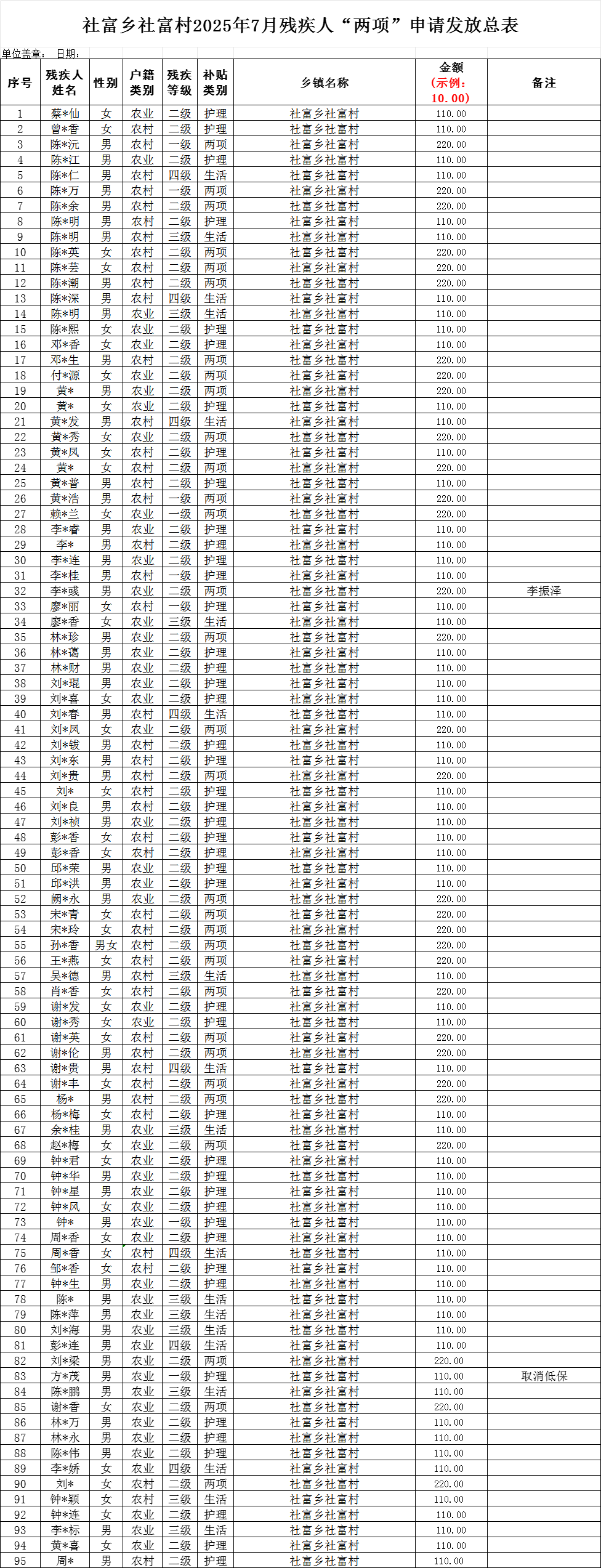 【社會救助】社富村2025年7月份殘疾人兩項補貼撥款名單公示