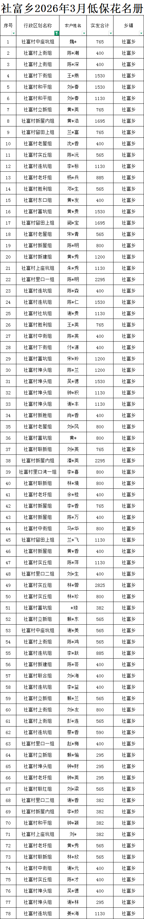 社富鄉社富村預報2026年3月份農村低保匯總名單