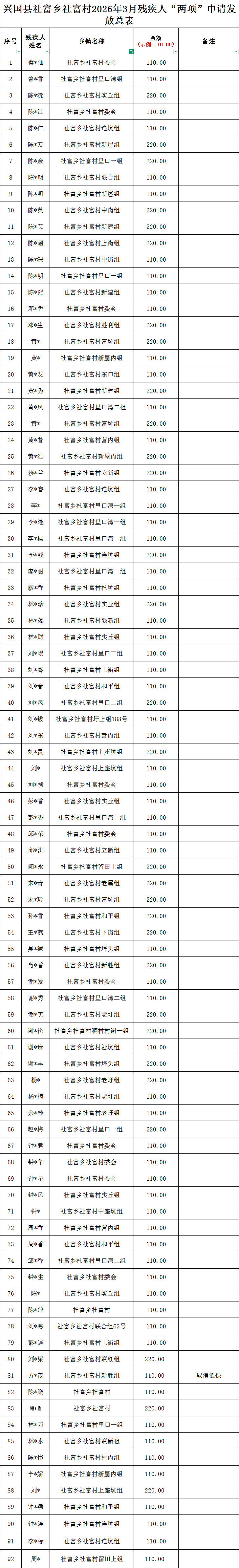 社富鄉社富村2026年3月份殘疾人兩項補貼撥款名單